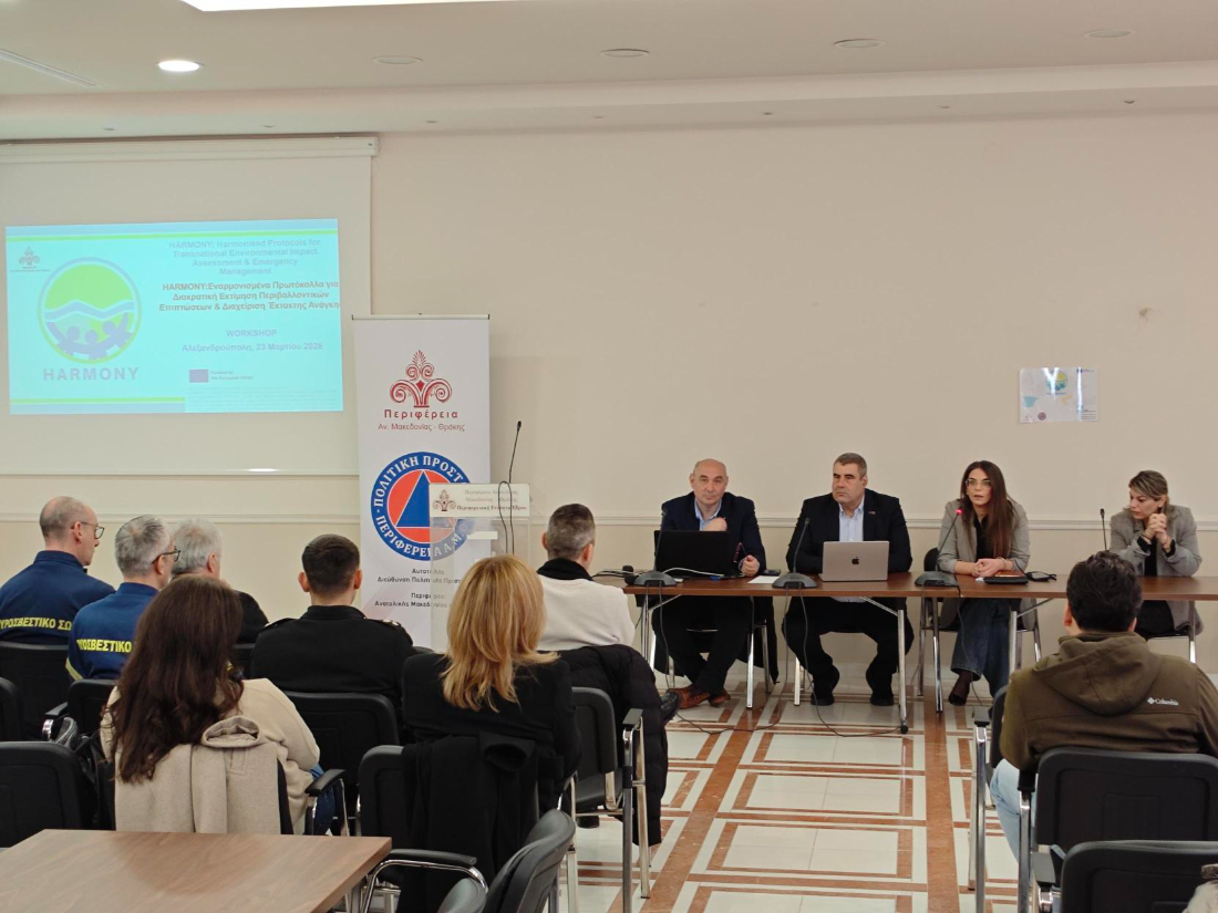 Με επιτυχία ολοκληρώθηκαν οι εργασίες του 1ου συμμετοχικού εργαστηρίου (co-creation workshop) που διοργάνωσε η Περιφέρεια Ανατολικής Μακεδονίας και Θράκης και η Αυτοτελής Διεύθυνση Πολιτικής Προστασίας Π.Α.Μ.Θ., ως δικαιούχος του έργου «Εναρμονισμένα πρωτόκολλα για διασυνοριακή περιβαλλοντική εκτίμηση επιπτώσεων και διαχείριση έκτακτων αναγκών» (HARMONY), το οποίο υλοποιείται στο πλαίσιο του Προγράμματος Horizon Europe.