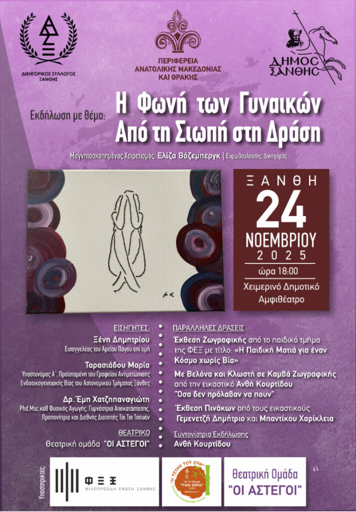 21ΝοέΗ Επιτροπή Ισότητας των Φύλων ΠΑΜΘ, ο Δικηγορικός Σύλλογος Ξάνθης και η Επιτροπή Ισότητας Φύλων Δήμου Ξάνθης ενώνουν δυνάμεις στο πλαίσιο της Διεθνούς ημέρας εξάλειψης της βίας κατά των γυναικών