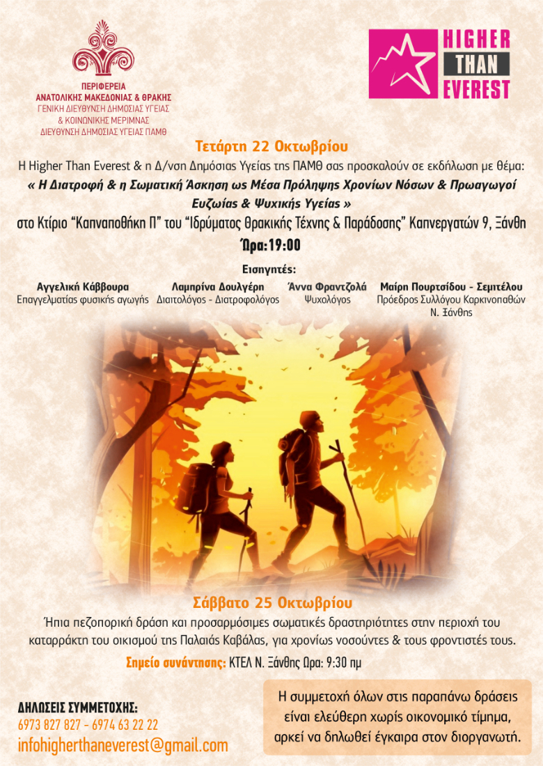 Στο πλαίσιο του προγράμματος «Υποστήριξη χρονίως νοσούντων και των φροντιστών αυτών», που υλοποιεί η Περιφέρεια Ανατολικής Μακεδονίας και Θράκης, διά της Διεύθυνσης Δημόσιας Υγείας και Κοινωνικής Μέριμνας, με την υποστήριξη της Higher Than Everest θα πραγματοποιηθούν δύο δράσεις στην Περιφερειακή Ενότητα Ξάνθης, την Τετάρτη 22 και το Σάββατο 25 Οκτωβρίου 2025. Οι δράσεις απευθύνονται σε όλους όσους έχουν βιώσει είτε προσωπικά είτε ως φροντιστές, αλλά ακόμη και ως συμπαραστάτες σε οικογενειακό ή φιλικό βιωματικό επίπεδο την εμπειρία κάποιας χρόνιας νόσου.