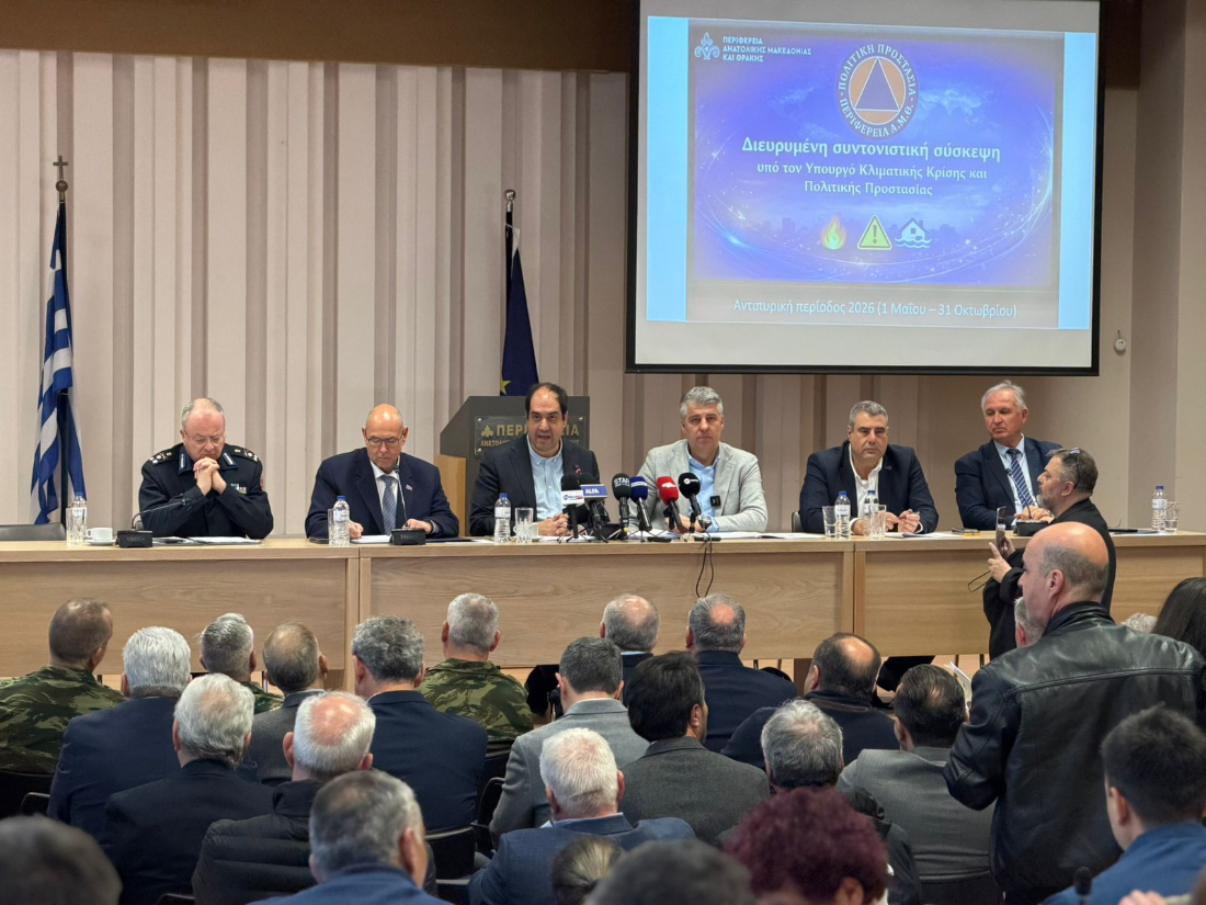 Διευρυμένη σύσκεψη του Περιφερειακού Συντονιστικού Οργάνου Πολιτικής Προστασίας (ΠΕΣΟΠΠ) για την «Προετοιμασία ενόψει Αντιπυρικής Περιόδου 2026 για την Περιφέρεια Ανατολικής Μακεδονίας & Θράκης», πραγματοποιήθηκε σήμερα, Τρίτη 17 Μαρτίου 2026, υπό τον Υπουργό Κλιματικής Κρίσης και Πολιτικής Προστασίας κ. Γιάννη Κεφαλογιάννη και τον Περιφερειάρχη κ. Χριστόδουλο Τοψίδη, στην αίθουσα συσκέψεων «Γ.Παυλίδης» στην Π.Ε. Ροδόπης (Πρώην Νομαρχία), στην Κομοτηνή. Η συνεδρίαση έγινε ενάμιση μήνα πριν την έναρξη της αντιπυρικής περιόδου, γεγονός που αναδεικνύει την έμφαση που δίνεται στην πρόληψη και την έγκαιρη προετοιμασία. Στη σύσκεψη συμμετείχαν ο Γ.Γ. Πολιτικής Προστασίας κ. Νίκος Παπαευσταθίου και ο Αρχηγός του Πυροσβεστικού Σώματος, κ. Θεόδωρος Βάγιας.