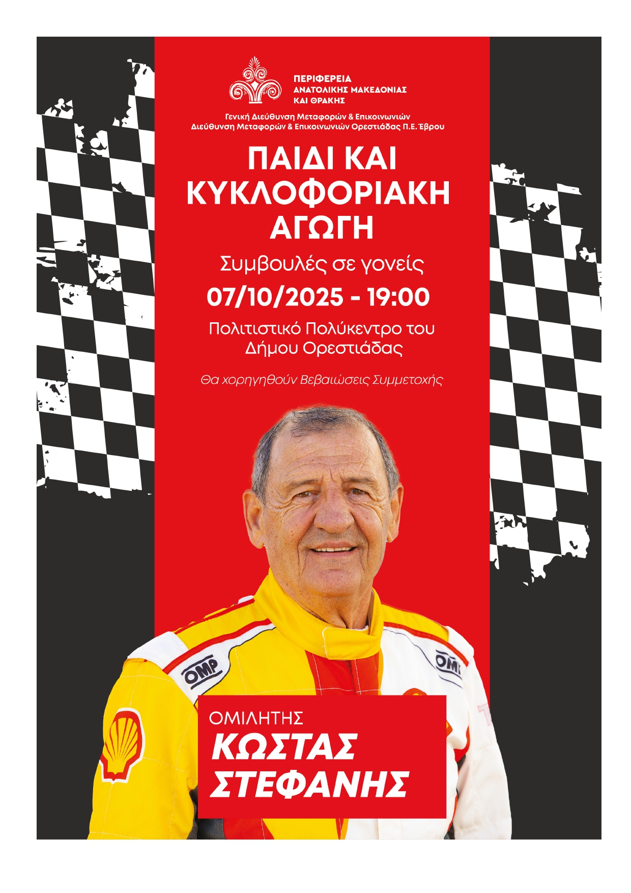 Η Περιφέρεια Ανατολικής Μακεδονίας και Θράκης, Γενική Διεύθυνση Μεταφορών και Επικοινωνιών, Διεύθυνση Μεταφορών και Επικοινωνιών Ορεστιάδας Π.Ε. Έβρου, διοργανώνει εκδήλωση με θέμα «Παιδί και κυκλοφοριακή αγωγή – συμβουλές σε γονείς», με κεντρικό ομιλητή τον Κώστα Στεφανή. Ο Κώστας Στεφανής που ειδικεύεται σε θέματα αυτοκινήτου, έχει πάρει μέρος σε πάνω από 300 αγώνες ράλι, έχοντας κατακτήσει 16 πρωταθλήματα και κύπελλα που έχουν διεξαχθεί στην Ελλάδα, ενώ έχει συμμετάσχει και σε δεκάδες διοργανώσεις του ράλι Ακρόπολις. Με τις τηλεοπτικές εκπομπές “Τροχοί και Δρόμοι“ και “Traction” παρουσιάζει θέματα αυτοκινήτου στο ευρύ κοινό.