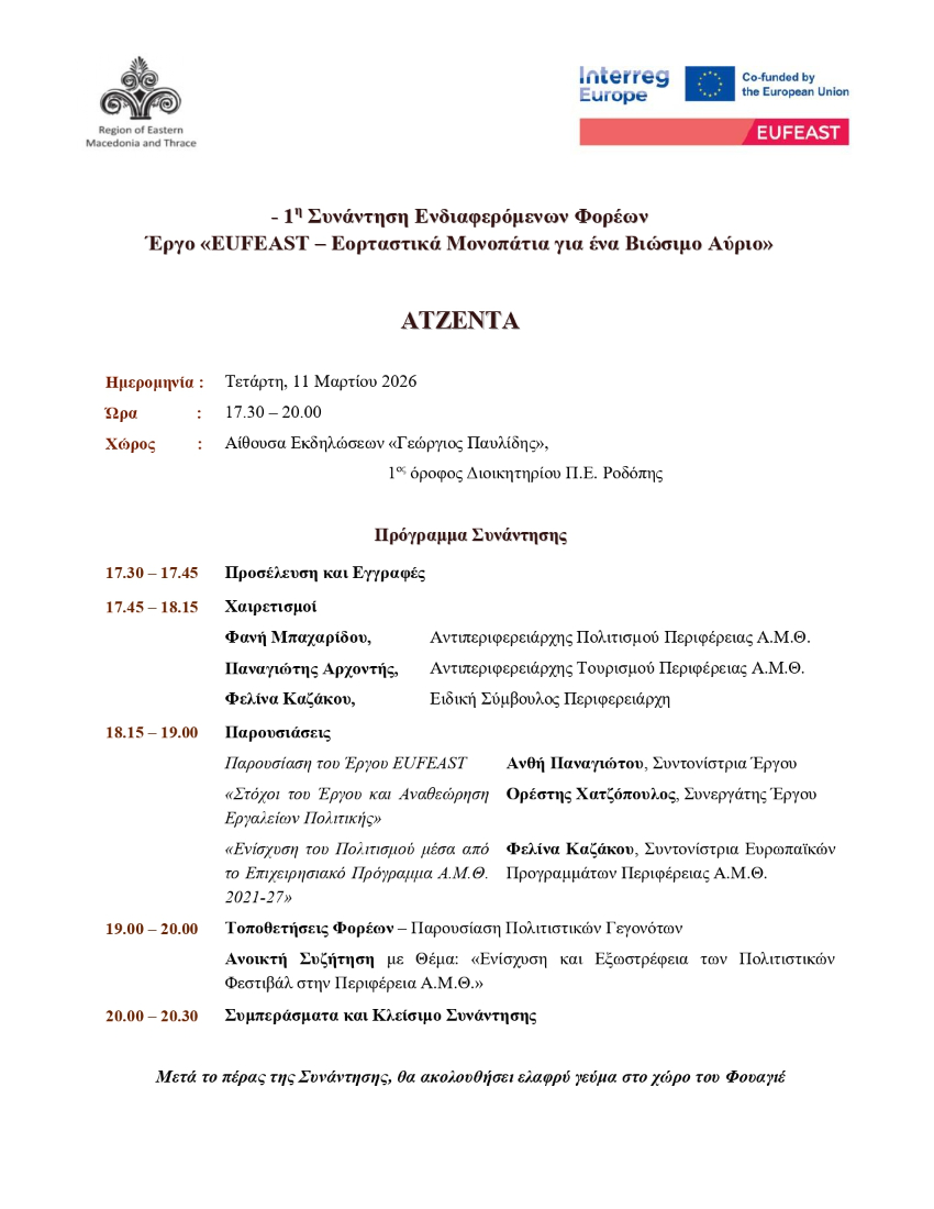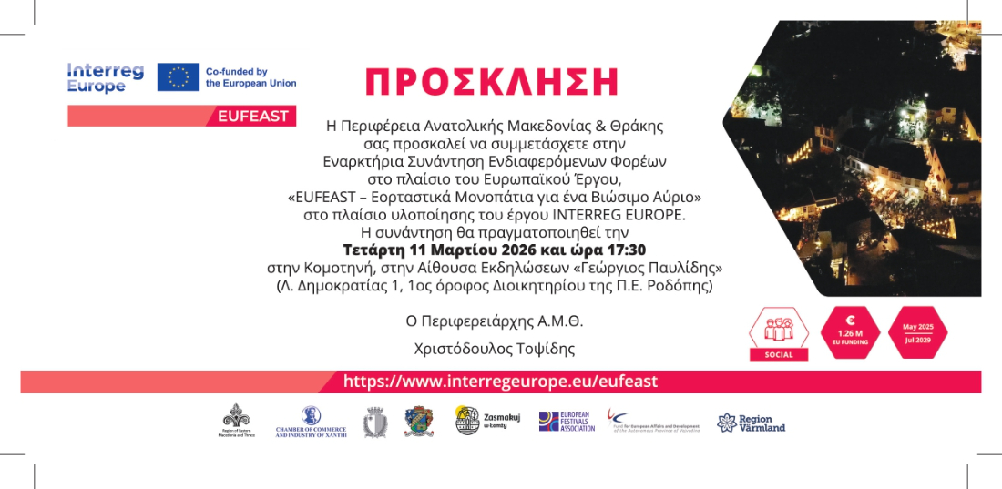 Η Περιφέρεια Ανατολικής Μακεδονίας και Θράκης σας προσκαλεί στην εναρκτήρια συνάντηση ενδιαφερόμενων φορέων στο πλαίσιο του Ευρωπαϊκού Έργου «EUFEAST – Εορταστικά Μονοπάτια για ένα Βιώσιμο Αύριο», του έργου INTERREG Europe. Η συνάντηση θα πραγματοποιηθεί την Τετάρτη 11 Μαρτίου 2026 και ώρες 17.30 – 20.00 μ.μ., στην αίθουσα εκδηλώσεων «Γεώργιος Παυλίδης», 1ος όροφος Διοικητηρίου Π.Ε. Ροδόπης, Κομοτηνή.