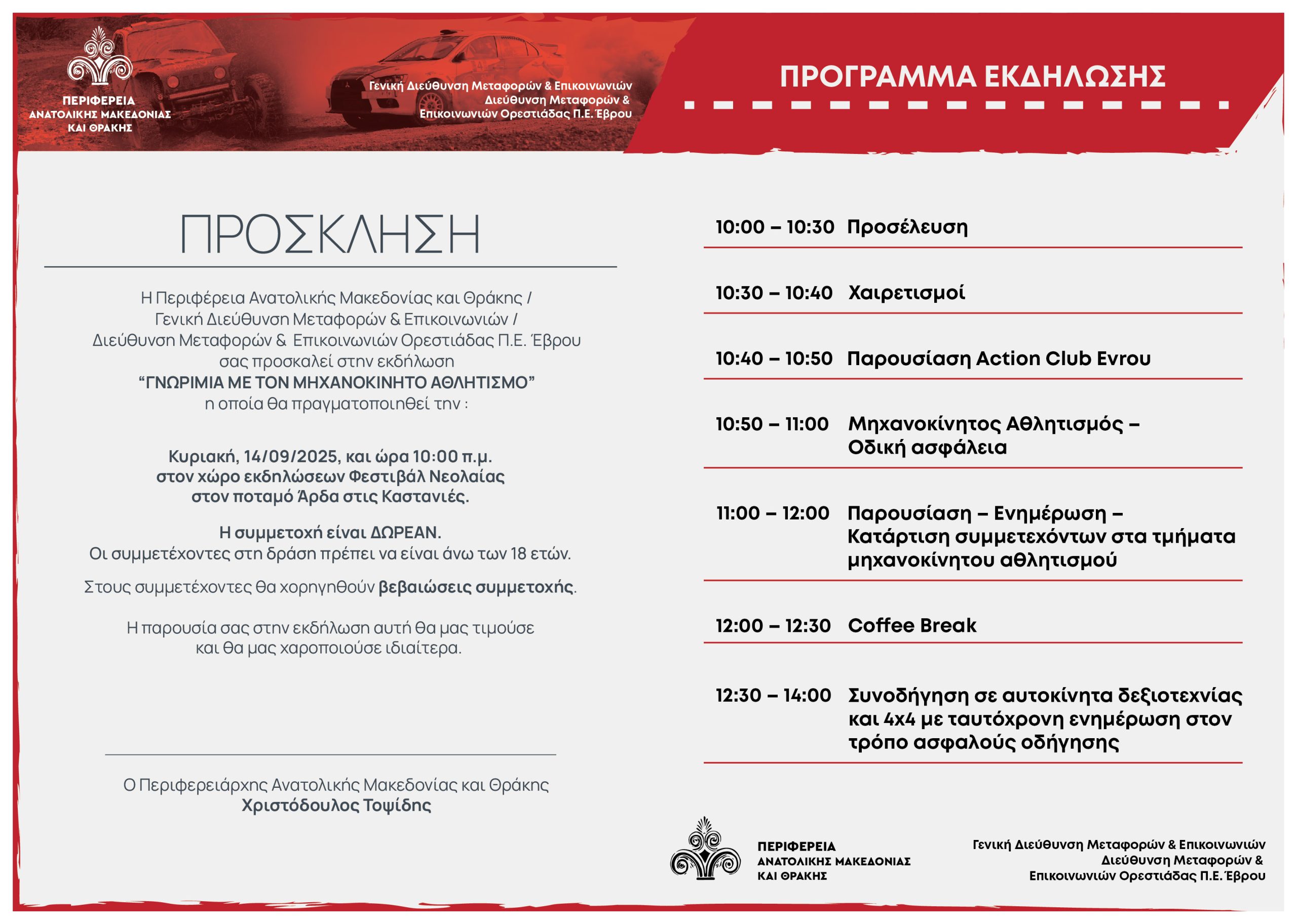 Την Κυριακή 14 Σεπτεμβρίου 2025, στον υπαίθριο χώρο εκδηλώσεων του Φεστιβάλ Νεολαίας στον ποταμό Άρδα στις Καστανιές, θα πραγματοποιηθεί ανοιχτή εκδήλωση – ενημέρωση – κατάρτιση με θέμα “Γνωριμία με το Μηχανοκίνητο Αθλητισμό”,