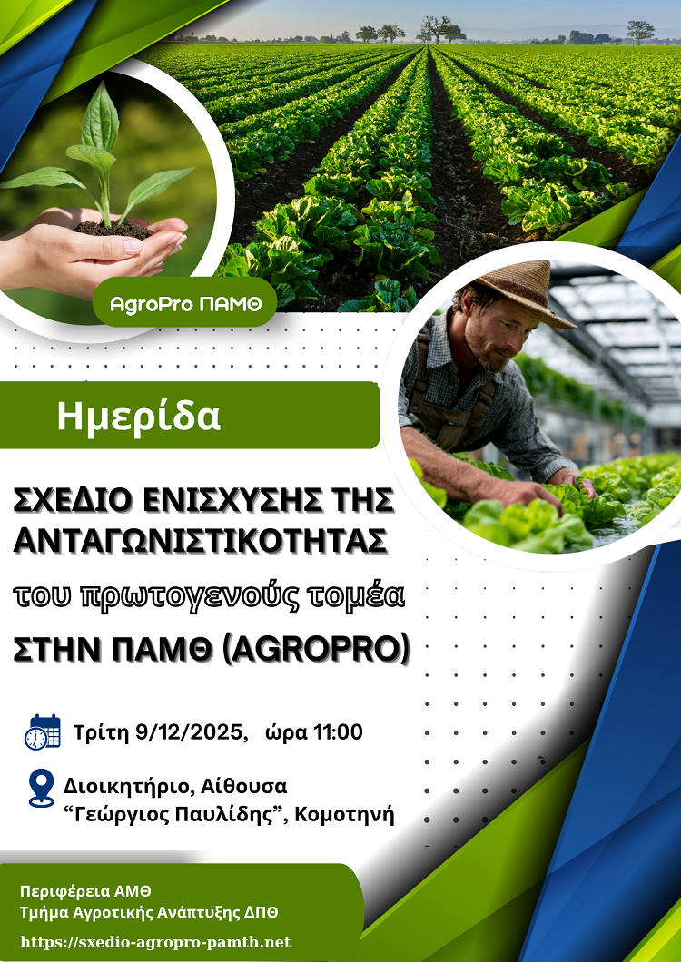 Η ομάδα έργου AgroPro-ΠΑΜΘ του Τμήματος Αγροτικής Ανάπτυξης (ΔΠΘ), σε συνεργασία με την Περιφέρεια Ανατολικής Μακεδονίας και Θράκης, σας προσκαλεί στην ενημερωτική ημερίδα του έργου: «Σχέδιο Ενίσχυσης της Ανταγωνιστικότητας του Πρωτογενούς Τομέα στην ΠΑΜΘ (AgroPro)». Η ημερίδα θα διεξαχθεί, την Τρίτη 9 Δεκεμβρίου 2025 στις 11 π.μ., στο Διοικητήριο Π.Ε. Ροδόπης, Αίθουσα “Γεώργιος Παυλίδης”. Κομοτηνή.