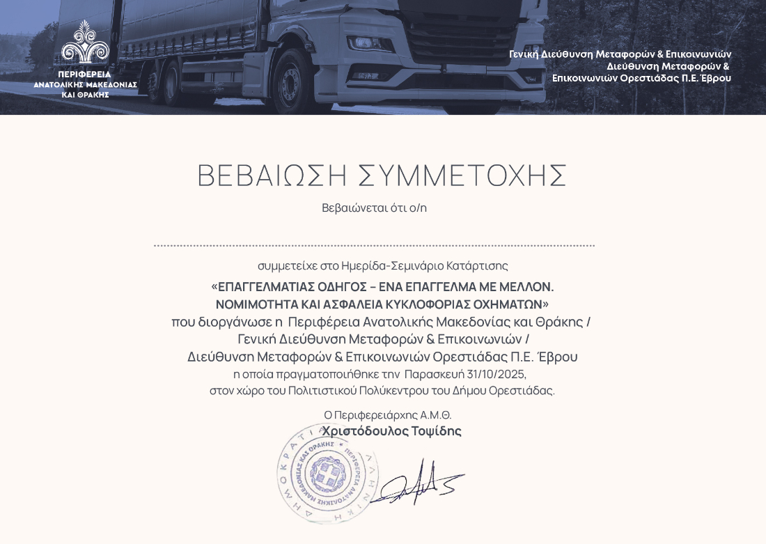 «Επαγγελματίας οδηγός, ένα επάγγελμα με μέλλον: Νομιμότητα και ασφάλεια κυκλοφορίας οχημάτων»