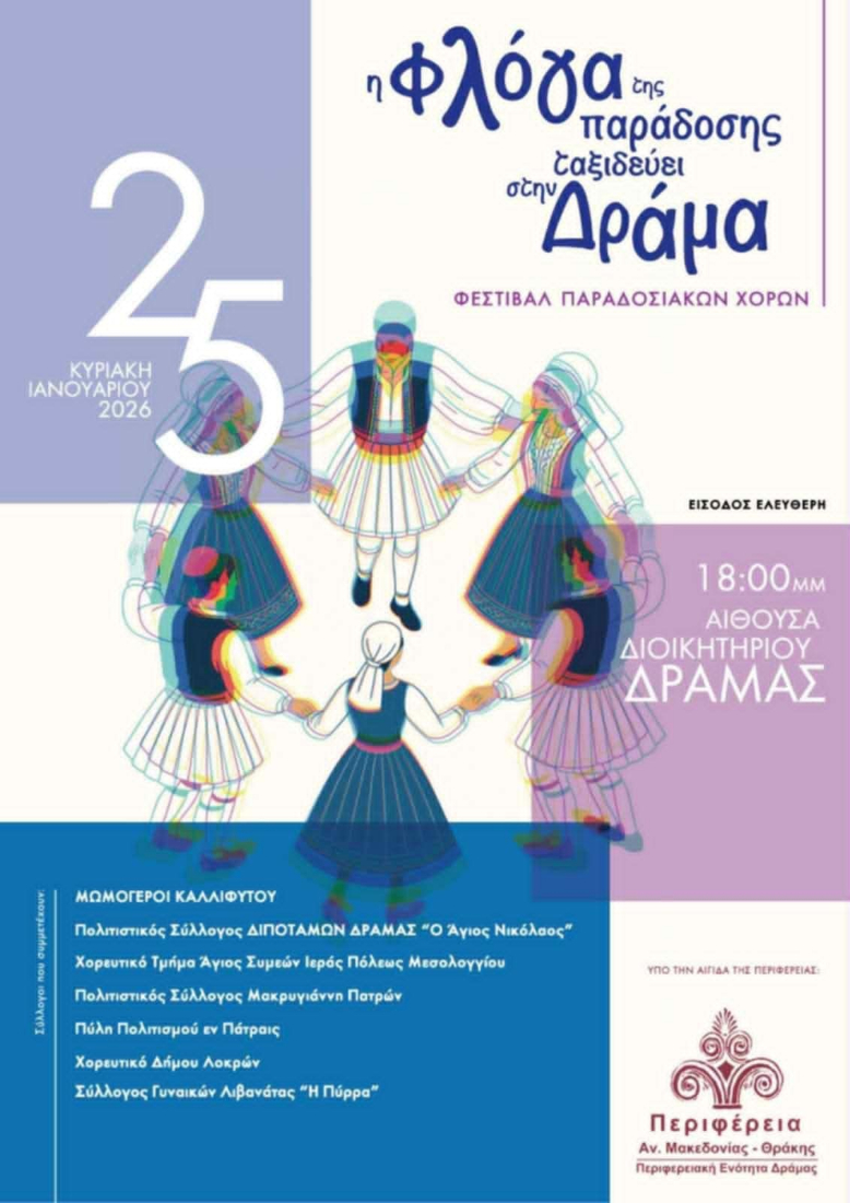 ΦΕΣΤΙΒΑΛ ΠΑΡΑΔΟΣΙΑΚΩΝ ΧΩΡΩΝ / ΔΡΑΜΑ – Η Φλόγα της παράδοσης ταξιδεύει στην Δράμα, Κυριακή 25 Ιανουαρίου, ώρα 18:00, Αμφιθέατρο Διοικητηρίου Δράμας