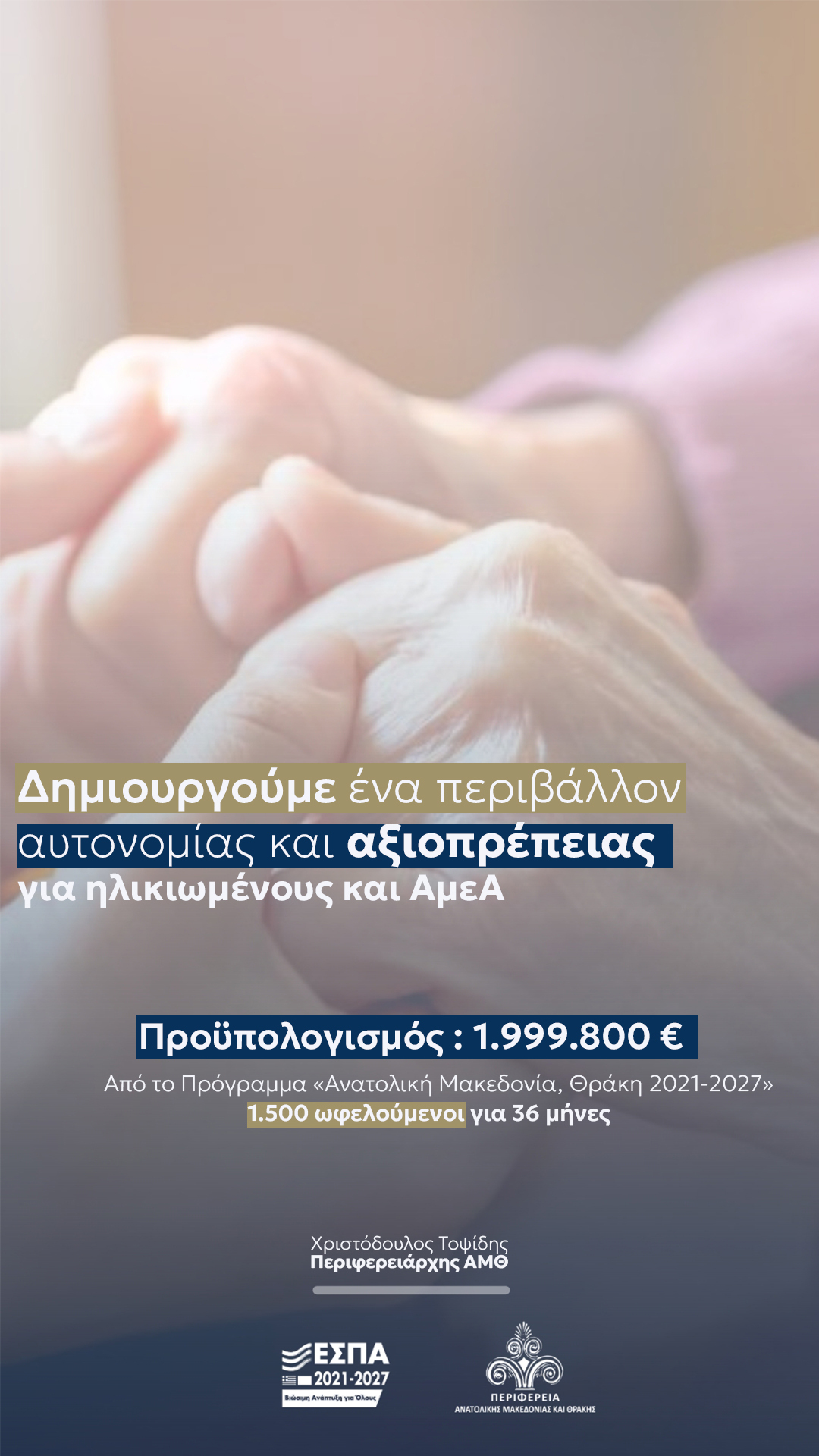 «Οι πολίτες της Περιφέρειας μας δικαιούνται ένα ασφαλές και υποστηρικτικό περιβάλλον, που διασφαλίζει την αυτονομία και την αξιοπρέπεια. Με τη νέα υπηρεσία για την υποστήριξη της αυτόνομης διαβίωσης και ασφαλούς γήρανσης, η Περιφέρεια Ανατολικής Μακεδονίας και Θράκης κάνει ένα σημαντικό βήμα για την ενίσχυση των υπηρεσιών κοινωνικής φροντίδας και την προαγωγή της ποιότητας ζωής ηλικιωμένων και ατόμων με αναπηρία».