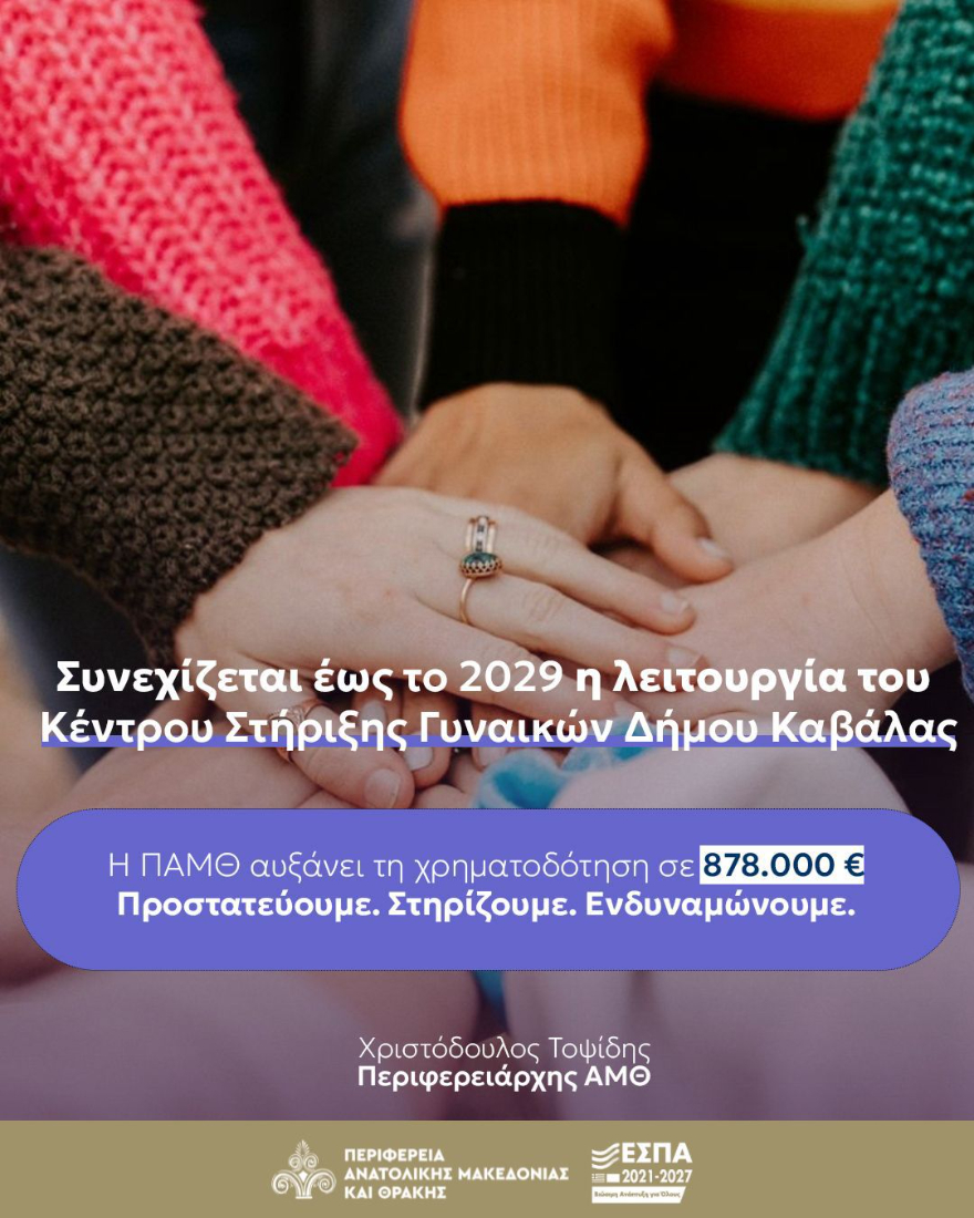 Με ευρωπαϊκούς πόρους της Περιφέρειας Ανατολικής Μακεδονίας και Θράκης διασφαλίζεται η συνέχιση λειτουργίας του Κέντρου Συμβουλευτικής Υποστήριξης Γυναικών Θυμάτων Βίας Δήμου Καβάλας. Με απόφαση του Περιφερειάρχη κ. Χριστόδουλου Τοψίδη, αυξάνεται η χρηματοδότηση από 249.500 € σε 878.000 € για την ομαλή λειτουργία της δομής έως 31-12-2029.