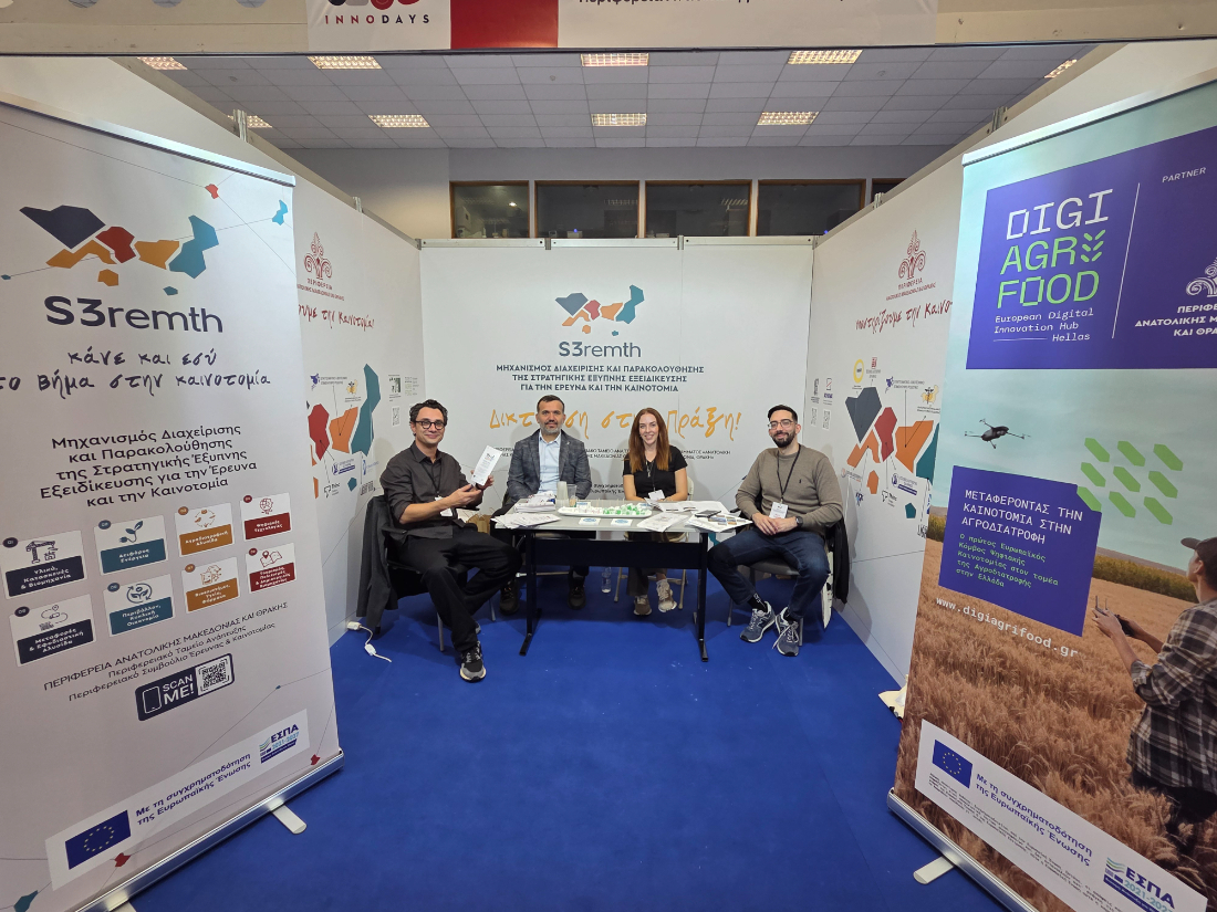 Η Περιφέρεια Ανατολικής Μακεδονίας και Θράκης, μέσω του Μηχανισμού Παρακολούθησης της Έρευνας και Επιχειρηματικότητας (S3remth) που συντονίζει το Περιφερειακό Ταμείο Ανάπτυξης ΑΜΘ, συμμετείχε με περίπτερο στη διοργάνωση της Περιφέρειας Κρήτης «Ημέρες Καινοτομίας – InnoDays», η οποία πραγματοποιήθηκε στο Ηράκλειο από τις 28 έως τις 30 Νοεμβρίου.