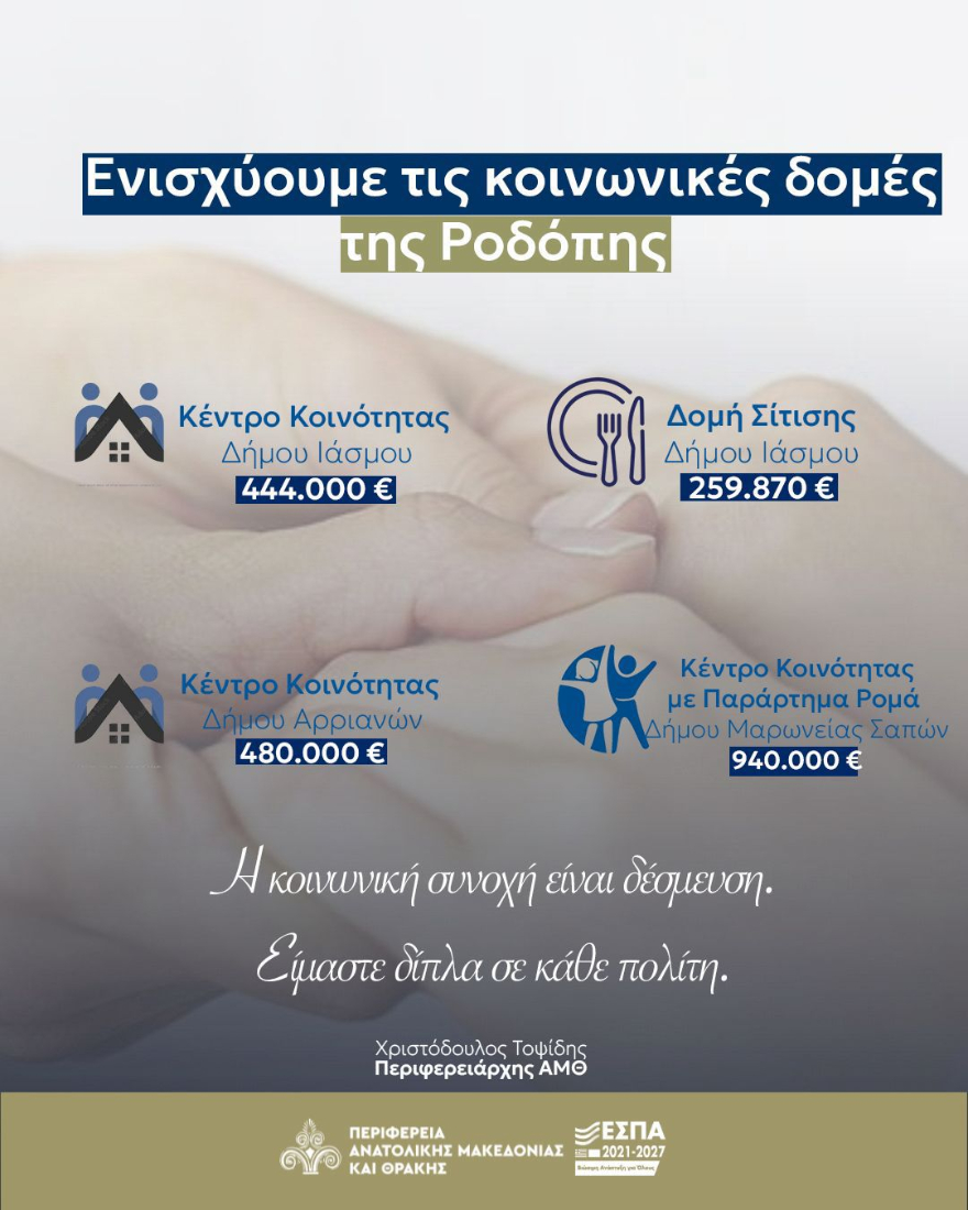 Τη συνέχιση λειτουργίας σημαντικών κοινωνικών δομών σε Δήμους της Περιφερειακής Ενότητας Ροδόπης, που βρίσκονται στην πρώτη γραμμή εξυπηρέτησης πολιτών και ιδιαίτερα όσων ανήκουν σε ευπαθείς ομάδες, διασφαλίζει η Περιφέρεια Ανατολικής Μακεδονίας και Θράκης, αξιοποιώντας ευρωπαϊκούς πόρους. Με ισάριθμες αποφάσεις που υπέγραψε ο Περιφερειάρχης κ. Χριστόδουλος Τοψίδης, το Κέντρο Κοινότητας και η Δομή Σίτισης Δήμου Ιάσμου, το Κέντρο Κοινότητας Δήμου Αρριανών και το Κέντρο Κοινότητας με Παράρτημα Ρομά του Δήμου Μαρωνείας – Σαπών, εντάχθηκαν στο Πρόγραμμα «Ανατολική Μακεδονία, Θράκη 2021-2027» και στην Προτεραιότητα «Κοινωνική Ενσωμάτωση και αντιμετώπιση της φτώχειας (ΕΚΤ+)».