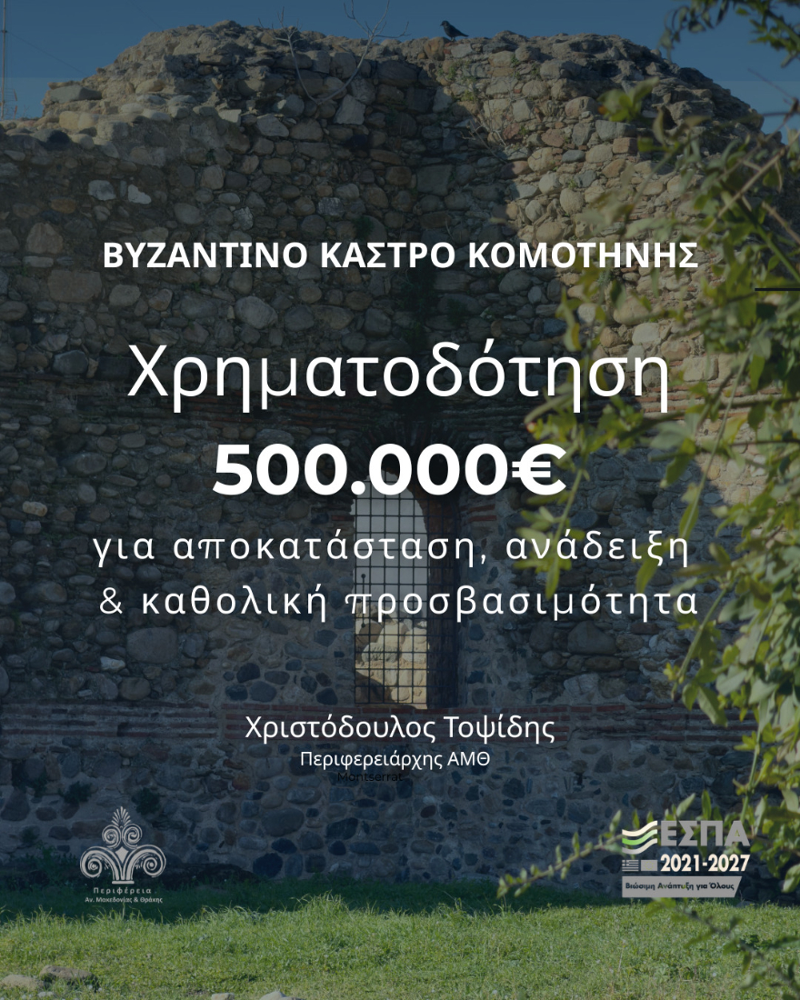 Με απόφαση που υπέγραψε ο Περιφερειάρχης Ανατολικής Μακεδονίας και Θράκης κ. Χριστόδουλος Τοψίδης, εντάχθηκε στο Πρόγραμμα «Ανατολική Μακεδονία και Θράκη 2021–2027» η Πράξη «Προστασία και ανάδειξη του Βυζαντινού Κάστρου Κομοτηνής», με συνολικό προϋπολογισμό 500.000 ευρώ και δικαιούχο την Εφορεία Αρχαιοτήτων Ροδόπης.