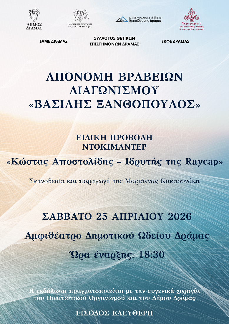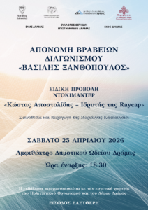 Πρόσκληση / Απονομή των Βραβείων τού Διαγωνισμού εις μνήμην Βασίλη Ξανθόπουλου – Σάββατο 25 Απριλίου, ώρα 18.30, Αμφιθέατρο Δημοτικού Ωδείου Δράμας