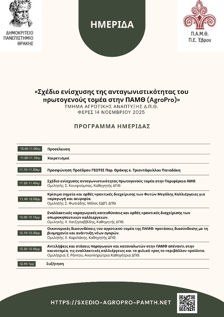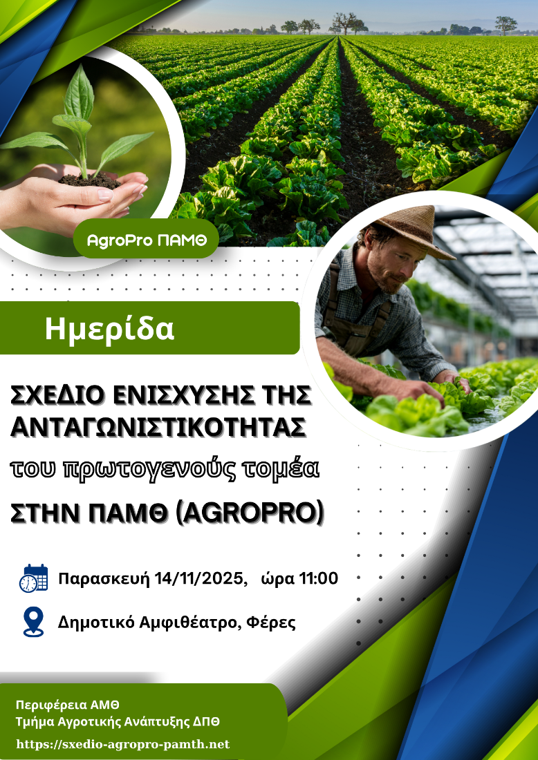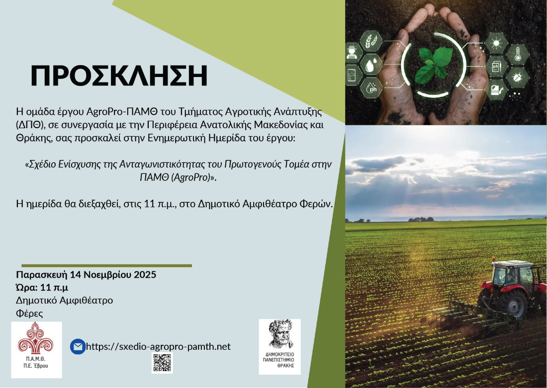 «Σχέδιο ενίσχυσης της ανταγωνιστικότητας του πρωτογενούς τομέα στην ΠΑΜΘ (AgroPro)» ΤΜΗΜΑ ΑΓΡΟΤΙΚΗΣ ΑΝΑΠΤΥΞΗΣ Δ.Π.Θ. ΦΕΡΕΣ 14 ΝΟΕΜΒΡΙΟΥ 2025