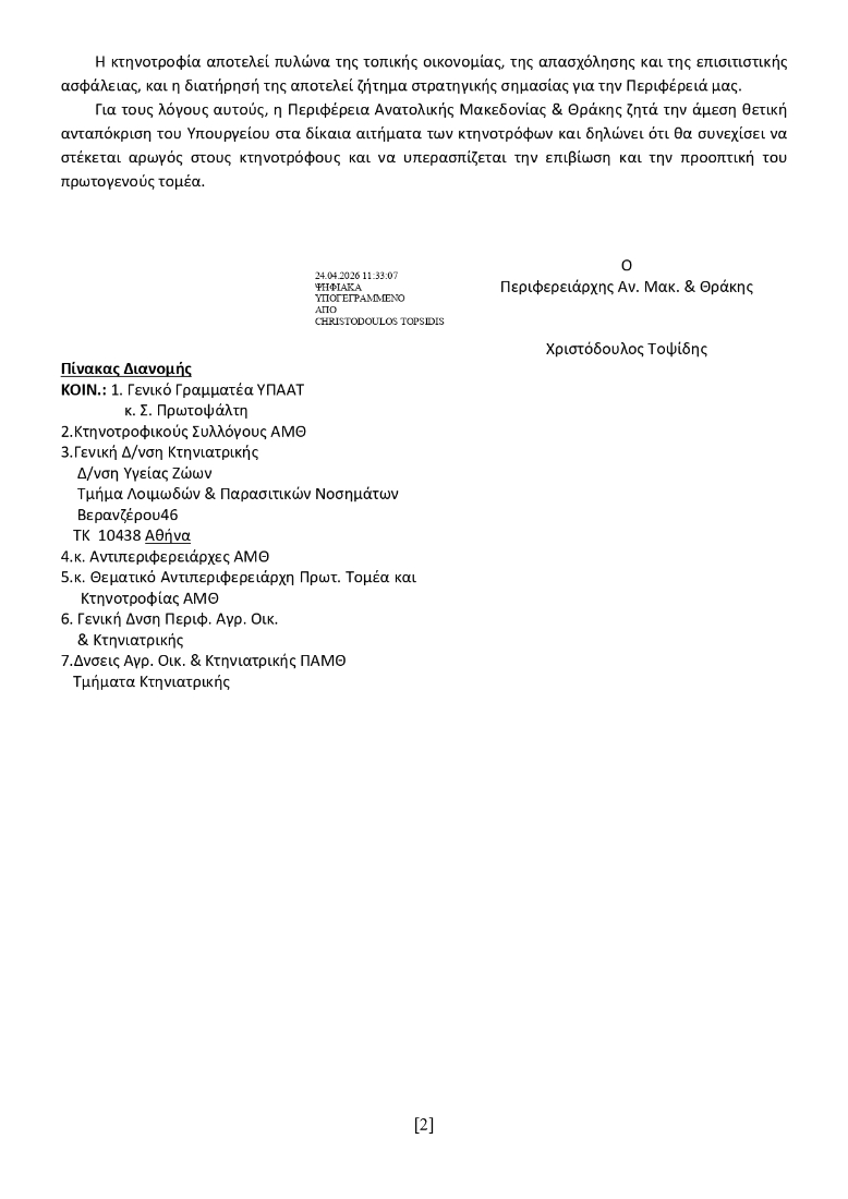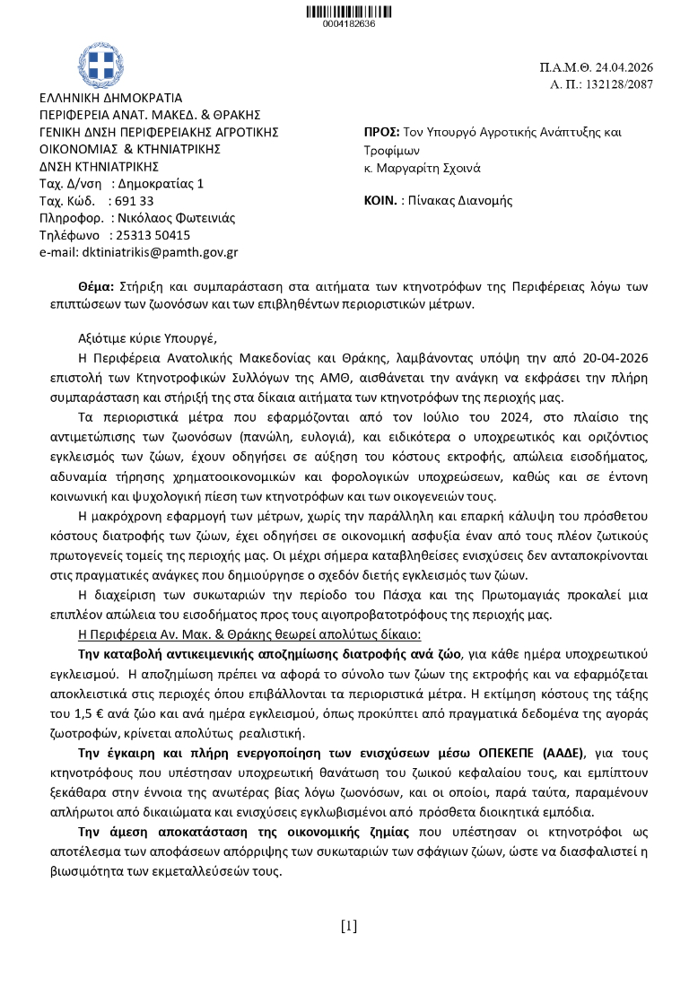 Την πλήρη στήριξή της στα δίκαια αιτήματα των κτηνοτρόφων, όπως αυτά διατυπώνονται στην από 20-04-2026 επιστολή των Κτηνοτροφικών Συλλόγων της ΑΜΘ, εκφράζει η Περιφέρεια Ανατολικής Μακεδονίας και Θράκης με επιστολή του Περιφερειάρχη κ. Χριστόδουλου Τοψίδη στον Υπουργό Αγροτικής Ανάπτυξης και Τροφίμων κ. Μαργαρίτη Σχοινά, αναδεικνύοντας τις σοβαρές επιπτώσεις από τα περιοριστικά μέτρα λόγω ζωονόσων.
